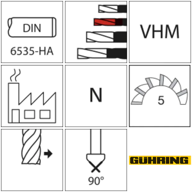 Design: with face cut to use the entire length of the cutting edge up to the base, 5 different helix angles (20 to 24°) and uneven cutting edge graduation, spiral cutting edge geometry with positive rake angle for soft cutting, quiet operation and high surface quality at large phases.