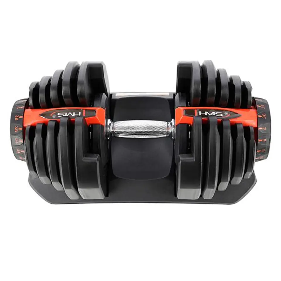 SR80 HMS is an adjustable dumbbell. The set includes a neck, 10 plates and a coaster. The device is an ideal solution for people exercising at home, but it will also work well in the training room, replacing the entire rack of traditional dumbbells. The use of an innovative plate mounting system allows you to quickly and easily change the load during training. Unlike traditional dumbbells, removing and putting on the plates does not require unscrewing the clamps and putting on and removing the plates every time. In the SR80, simply put the dumbbell on the stand and set the desired load with two knobs. When you lift the dumbbell again, there will be plates corresponding to the selected setting. The product is made of the highest quality materials. A big advantage of the SR80 HMS is the ergonomically shaped dumbbell handle, covered with non-slip material. Adjustable HMS dumbbells are an innovative solution for lovers of strength sports - 10 plates allow for any load adjustment depending on the user's needs. Specification: Material: Steel, PP Weight: Total: 40 kg Stand: 2.6 kg Barbell: 37.4 kg Load adjustment range: 3.9 - 37.4 kg Dimensions (dumbbell): Length: 45,5 cm Handle length: 12,5 cm Diameter of plates: 17 - 24 cm Stand dimensions: Length: 43 cm Width: 24 cm Height: 11,5 cm Notes: Not intended for commercial use Warranty 24 months SR adjustable dumbbells due to the scope of patent protection cannot be distributed in any way in the following countries: Germany, England, Austria, Belgium, Bulgaria, Cyprus, Czech Republic, Denmark, Estonia, Finland, France, Greece, Hungary, Ireland, Italy, Luxembourg, Monaco, Netherlands, Portugal, Romania, Slovakia, Slovenia, Spain, Sweden, Switzerland and Turkey.