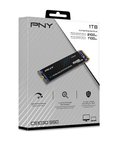 The PNY CS1030 M.2 NVMe SSD is the perfect choice for an NVMe upgrade from a SATA-based solid-state drive (SSD) or a traditional hard drive in an NVMe-enabled desktop or laptop computer. The CS1030 is designed as an upgrade to conventional SATA-based storage to take advantage of the high bandwidth of the NVMe interface to help reduce boot times, launch applications faster and improve overall system performance. Do more in less time with NVMe; boot, shut down and load applications up to 4 times faster than SATA-based SSDs. With no moving parts, the PNY CS1030 M.2 NVMe SSD is highly durable, less prone to failure and backed by a 5-year limited warranty or TBW.