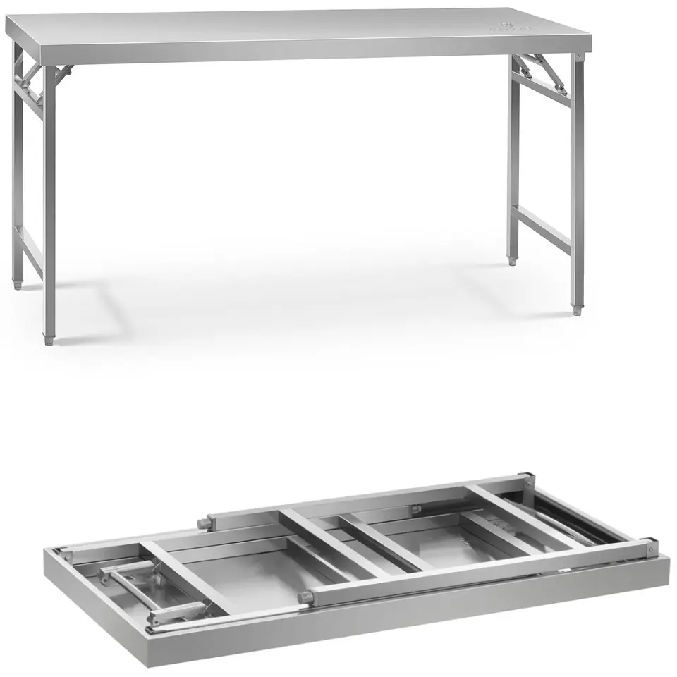The table has a spring folding system - it can be quickly and easily folded and transported. It was made of stainless steel, which is a guarantee of durability and stability during operation. It is resistant to corrosion, stubborn dirt and mechanical damage. It does not react with food, it is safe for health. The table top with dimensions of 180x60 cm provides a lot of space. Thanks to the adjustable feet, the height of the table can be changed in the range of +/- 10mm. The lifting capacity of the table is 230 kg.