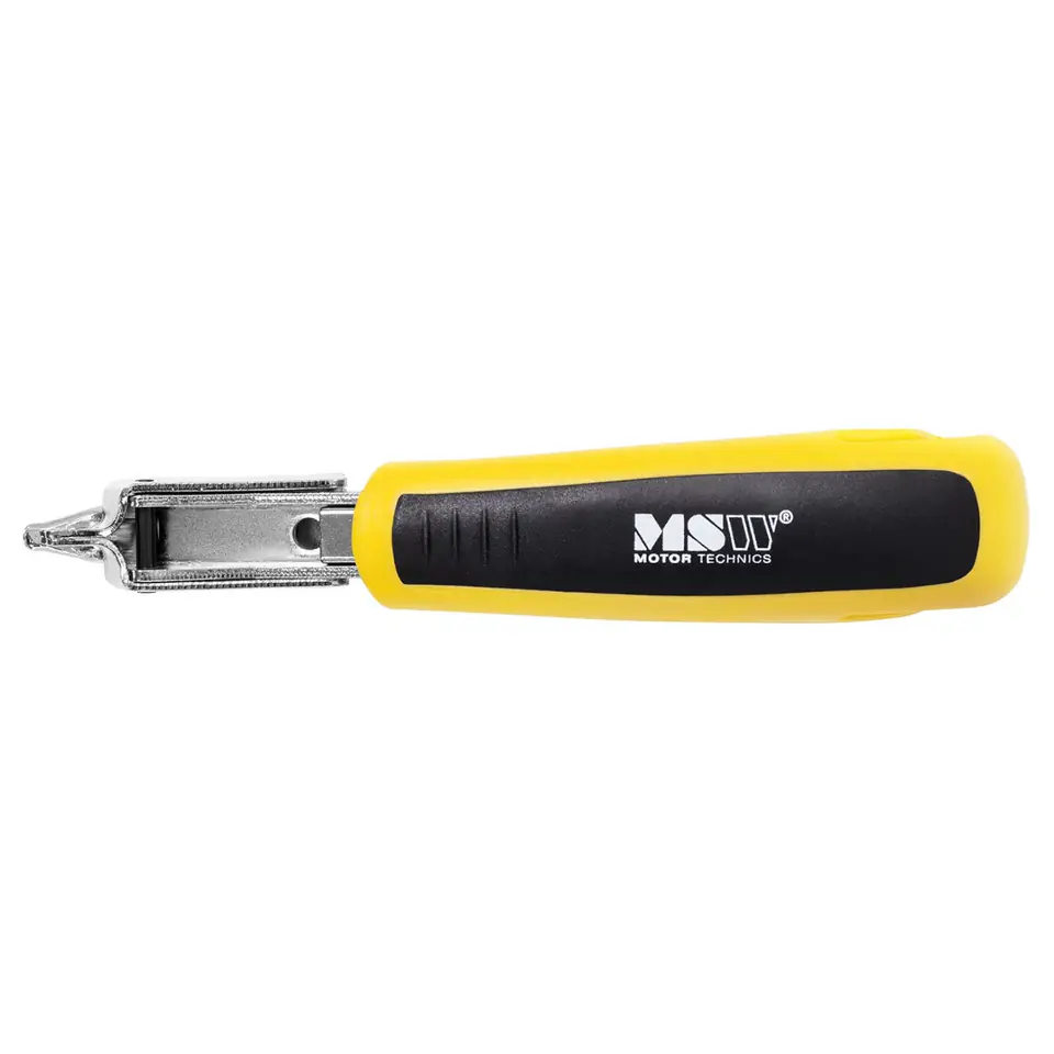 The MSW hammer upholstery stapler allows you to attach leather, felt, roofing felt, carpeting or various insulation materials. The equipment is made of hardened carbon steel. Thanks to the high quality of workmanship, the taker is extremely durable and withstands heavy loads. Ergonomic handle fits securely in the hand. Plastic coating prevents slipping. For stapling, flat staples of 6 - 14 mm are used. The set includes a stapler, thanks to which defective staples can be conveniently pulled out.