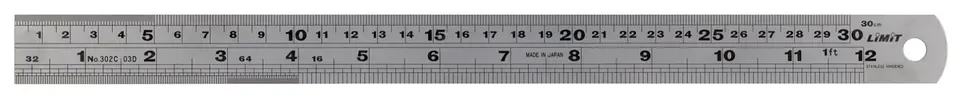 Hardened stainless steel. Chrome matt, non-reflective. Graduations marked on one side - at the top mm/mm, at the bottom inches.