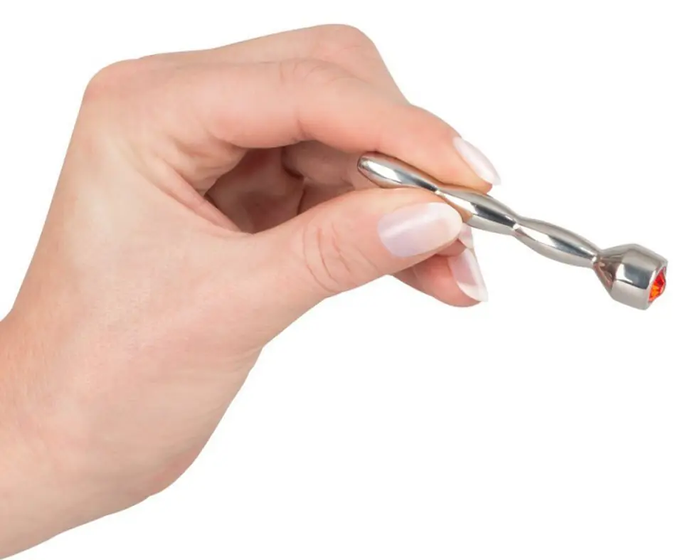 Steel corrugated dilator with red stone. Length 7.1 cm, penetration depth 5.5 cm, Ø 0.5 to 0.8 cm.