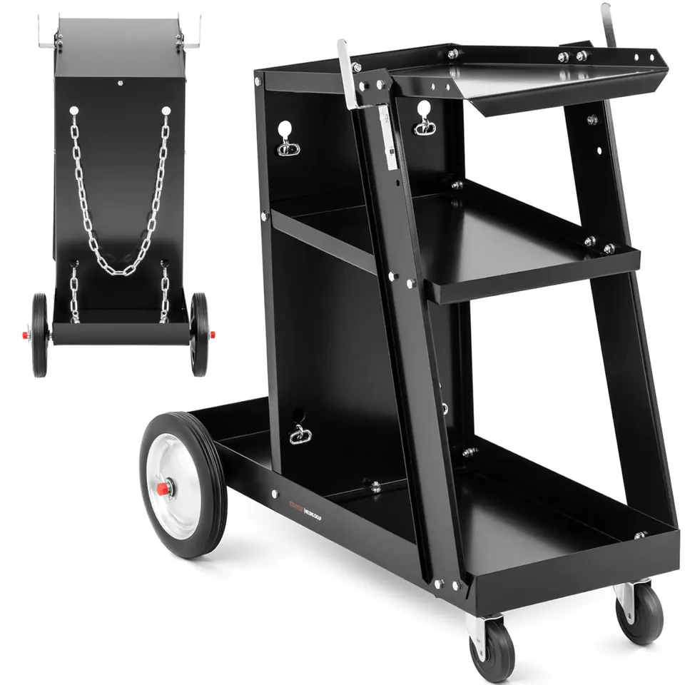 The Stamos Welding Group welding trolley allows you to store and conveniently transport welding tools and equipment. The maximum load capacity of the trolley is 80 kg. The device has 3 large shelves, as well as a shelf for a gas cylinder and two metal chains to keep it in the right position. On both sides there are cable holders. 4 wheels provide mobility for the device. Pair of rear wheels with avg. 190 mm is a support for the structure, front wheels smaller and swivel (360 degrees) increase its controllability. The stroller is made of steel painted black, it is durable and comfortable to use.
