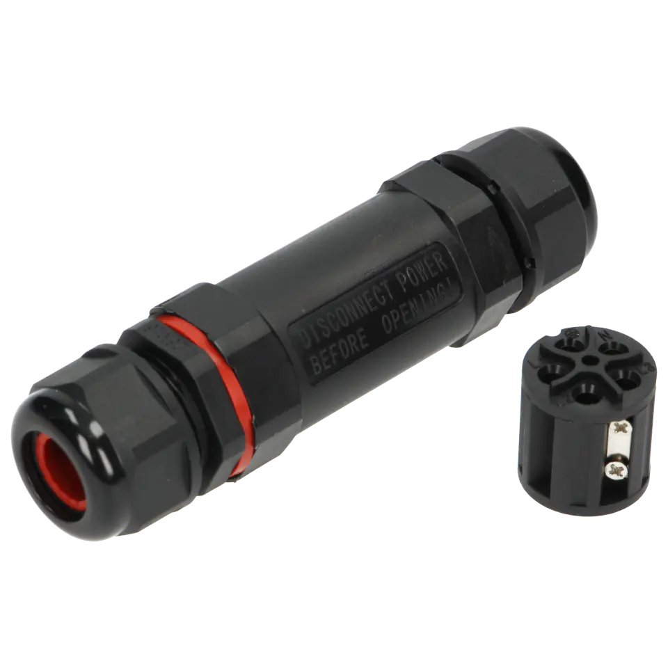 Cable connector, with a simple shape and a high degree of IP68 tightness, which guarantees protection against external factors. It has a well-fitting connection block gasket and a thick rubber gasket at the gland, which thoroughly seals the inserted wires. The material used in the production of the connector is resistant to UV rays and is suitable for outdoor use. The contacts are made of brass, additionally protected against oxidation with a layer of nickel.