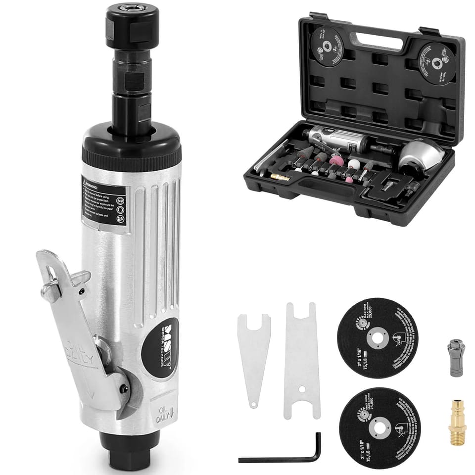 The MSW pneumatic grinder will work well for grinding, separating, polishing, milling, trimming as well as processing or roughing. The device operates at a speed of 25000 rpm. It is driven by air with a flow rate of 113 l / min with a maximum pressure of 6.2 bar. The rotational speed can be set depending on the type of work. With the help of an adapter, you can transform the grinder into an efficient cutter. The handle has an ergonomic shape and the lightweight design allows comfortable work even for a long time. The compressed air is discharged laterally by 360 via a rotating outlet. High-quality gearbox and bearings ensure long service life with low maintenance requirements. The set includes a suitcase and a wide range of accessories for 1/4"' and 1/8"' handles.