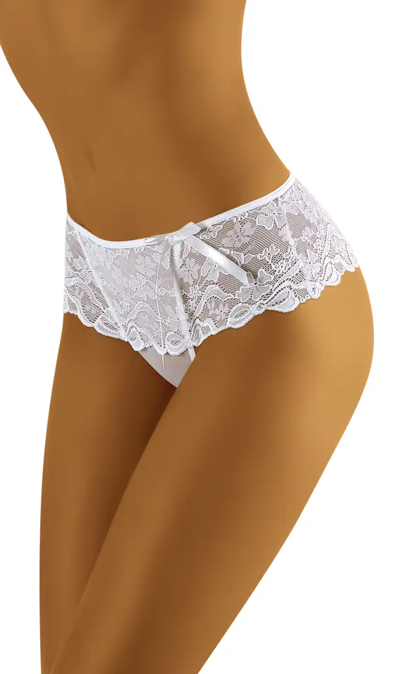Charming string-shorts richly decorated with beautiful, wide lace. Slightly taller, a'la shorts, cleverly combine comfort and grace. Transparent fabric, with the effect of clearance. Composition: 87% polyamide, 13% elastane.