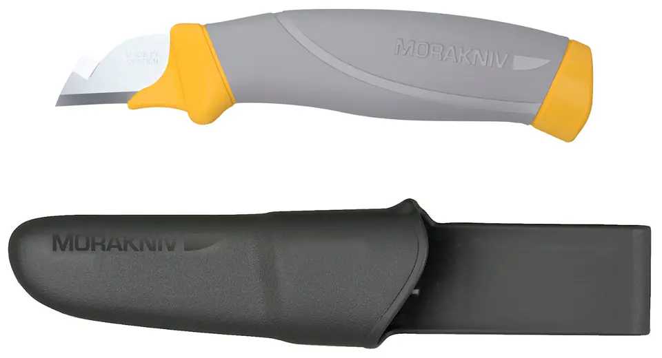 Special function of stripping insulation from the cable. Integrated ergonomic finger on blade protection, double-cast handle and stainless steel blade. Safe handling. Prevents injuries at work. Sheath made of impact-resistant plastic with easy hanging and removing, both at the waist and on the button.