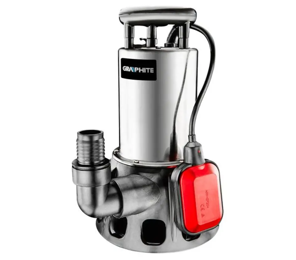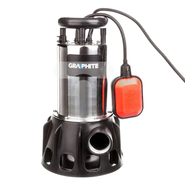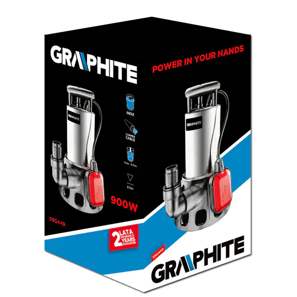 GRAPHITE submersible water pump (ref. no. 59G449) with a power of 900 W, designed to pump clean and dirty water, the amount of impurities should not exceed 20 mm. The pump capacity is 17000 liters per hour. Made of stainless steel, the device has I protection class, IP68 degree. The maximum working immersion depth is 8 m, and the water lifting depth is a maximum of 9 m. The device has the function of automatic switching on and off the pump depending on the change in the water level. The pump is equipped with a long copper power cord and a carrying handle. The device should not be used to pump water for food purposes. Included with the pump are: connectors, connectors and plugs. Compliance with European standards is ensured by the CE certificate.