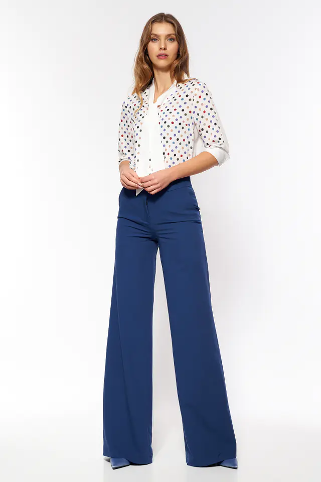 Niezwykle subtelna bluzka w kolorowe grochy to idealne dopełnienie stroju typu soft office. Bluzeczka odzwierciedla modowy powrót do szalonych lat 60. Wzór w kropki wdzięcznie dodaje dziewczęcego wyglądu. Bluzka posiada print tylko z przodu tył jest gładki. Skład: 98% poliester, 2% elastan. Modelka na zdjęciu ma 177 cm wzrostu i ma na sobie rozmiar 36.