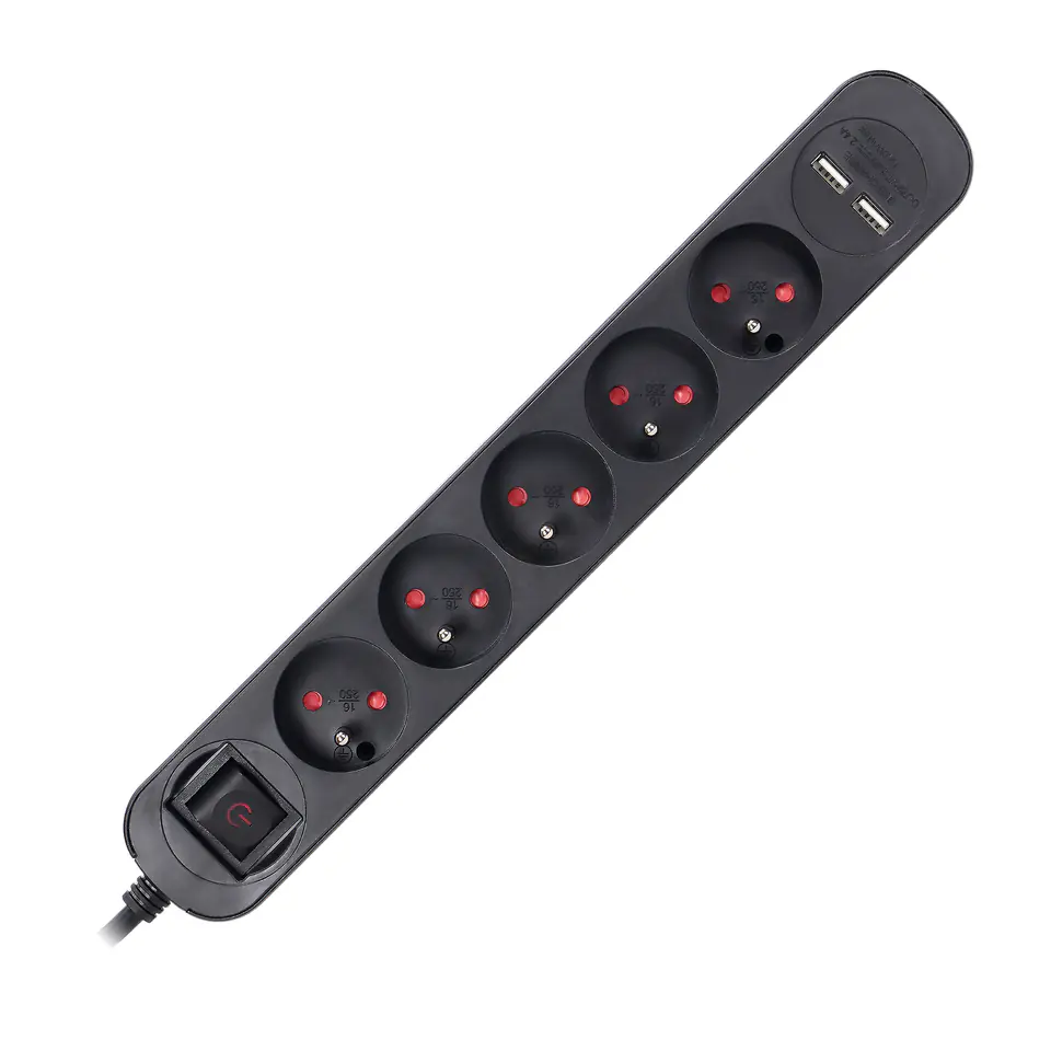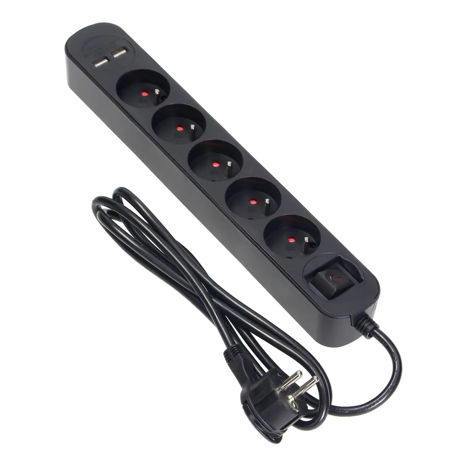The surge protector with a 1.5-meter cable allows you to connect 5 electrical devices with a total power consumption of 2300W. The sockets have a grounding pin. The power can be switched off with a double-track, illuminated main switch. The device effectively protects the connected equipment against voltage surges caused by weather conditions or network failures. It has 2 USB inputs and a flat plug.