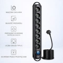 In our assortment, you can find surge protectors in a few variants. They differ in terms of amounts of sockets and cable length so you will find the right one for sure. A backlit footswitch is a practical element. When it lights up you can be sure that your devices will get a dose of energy. This is a very comfortable solution you dont have to bend down just put your surge protector on the floor and turn it on or off comfortably.