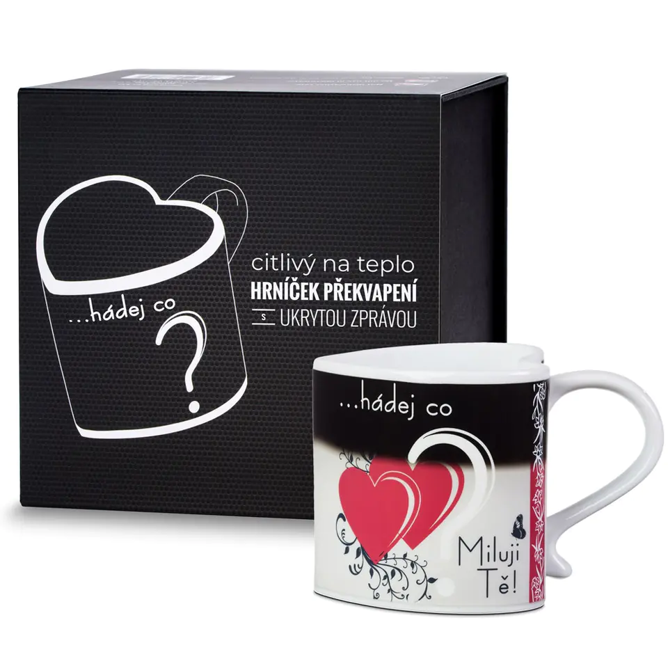 Magic Color Changing Mug: The Surprising Deluxe Cup is a thermoactive heart-shaped mug with a hidden message, packed in an elegant gift box. At first glance, all you can see on it is the question You know what?, placed on a black background. When you pour a hot drink into a cup, its appearance will completely change. Black paint will gradually fade, revealing hearts and the inscription I love you. Not only for Valentine's Day: Although this gift will especially work well during the Day of Lovers or the anniversary, any other day is equally good to say to someone "I love you". A love cup that changes the appearance, hidden in a black gift box, is also ideal as a gift without an occasion, both for her and for him. Surprising news in this form will awaken feelings and brighten up every day of a loved one. Express feelings by surprise: The best way to express your feelings is to do it by surprise. Such a tender gesture will impress your loved one and will be remembered, and every coffee or tea will be associated with you. The cup is packed in an elegant gift box, so it awakens the imagination before opening. If you want to please yourself as well, pour a hot drink over the eyes of your other half and watch her reaction. How it works:The mug has been covered with a special paint, which - when the cup is hot - gradually reveals the hidden message. If you want to surprise someone, all you have to do is pour a hot drink into it. When you cool the cup, the heart and inscription will gradually fade. This gadget is a dream gift for a girl – it hides a secret, is cute, appeals to feelings, and is nicely packed.