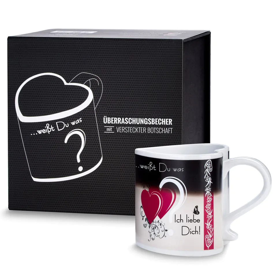 Magic Color Changing Mug: The Surprising Deluxe Cup is a thermoactive heart-shaped mug with a hidden message, packed in an elegant gift box. At first glance, all you can see on it is the question You know what?, placed on a black background. When you pour a hot drink into a cup, its appearance will completely change. Black paint will gradually fade, revealing hearts and the inscription I love you. Not only for Valentine's Day: Although this gift will especially work well during the Day of Lovers or the anniversary, any other day is equally good to say to someone "I love you". A love cup that changes the appearance, hidden in a black gift box, is also ideal as a gift without an occasion, both for her and for him. Surprising news in this form will awaken feelings and brighten up every day of a loved one. Express feelings by surprise: The best way to express your feelings is to do it by surprise. Such a tender gesture will impress your loved one and will be remembered, and every coffee or tea will be associated with you. The cup is packed in an elegant gift box, so it awakens the imagination before opening. If you want to please yourself as well, pour a hot drink over the eyes of your other half and watch her reaction. How it works:The mug has been covered with a special paint, which - when the cup is hot - gradually reveals the hidden message. If you want to surprise someone, all you have to do is pour a hot drink into it. When you cool the cup, the heart and inscription will gradually fade. This gadget is a dream gift for a girl – it hides a secret, is cute, appeals to feelings, and is nicely packed.