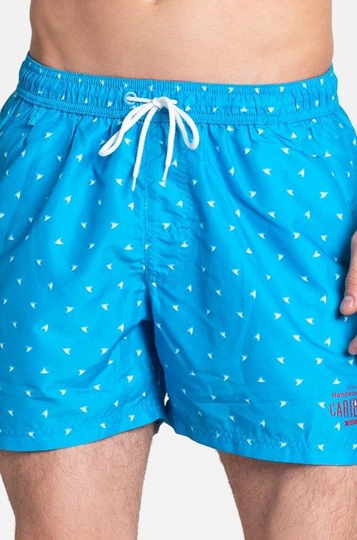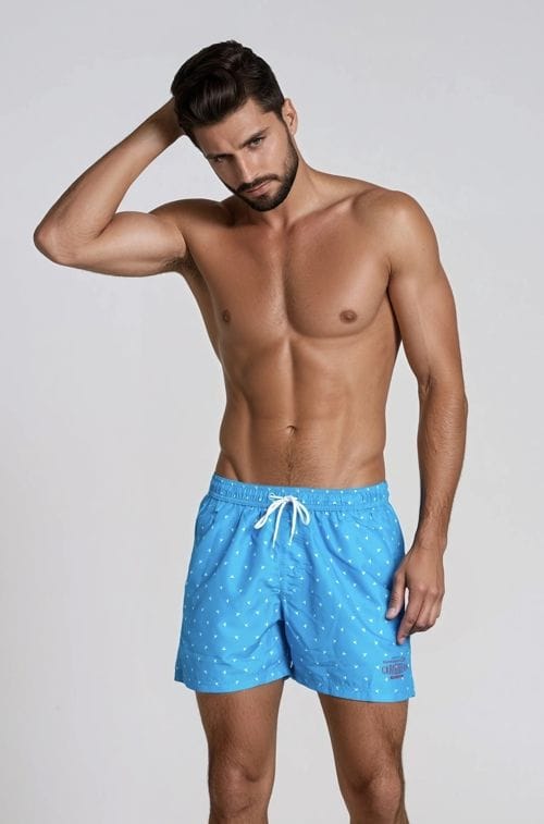 Very comfortable, loose bath shorts on the lining, from the latest collection of the Henderson brand, Summer 2021 edition. They are distinguished by a great blue color (in a beautiful shade) covered with a fine pattern. Comfortable cut: comfortable, elastic, soft rubber at the waist with additional drawstring to adjust the circumference. Quick-drying fabric. A pocket with a loop on the back. Composition: 100% polyester.