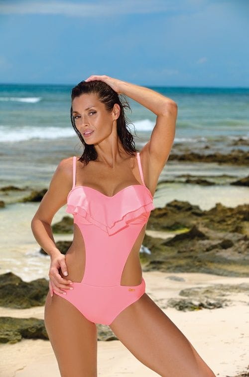 One-piece, monokini cut - has cut sides, which gives the whole a modern character. The top of the costume is created by a sexy push-up, and precisely profiled cups, stiffened with a special foam, with a built-in push-up filling (push-up occurs in every size of the costume). The cut lifts and enlarges the breasts, creating a sexy neckline, decorated with an airy frill And that's not all. The costume is made of Italian, elastic fabric, it is smooth, comfortable, tied at the back and has completely detachable straps. Juicy colors to choose from in as many as a dozen variants - choose it in your favorite color. Composition: 80% polyamide, 20% elastane.