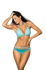 Cute two-piece swimsuit with well-contoured cups. One that creates a tempting neckline. The cups perfectly collect breasts, model them well and at the same time push them upwards. From the inside, they have been stiffened and enriched with a permanently built-in push up filling (available in all sizes), with side underwires. Cute trimming immediately catches the eye. Straps with brooches, elegant, tied around the neck. The circumference is conveniently tied on the back. At the base - a gently ruffled fabric, which emphasizes the unique character of the costume. Briefs with an additional strip that runs around the hips. Soft, lining.