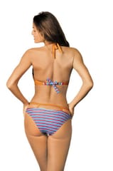 Cute two-piece swimsuit with well-contoured cups. One that creates a tempting neckline. The cups perfectly collect breasts, model them well and at the same time push them upwards. From the inside, they have been stiffened and enriched with a permanently built-in push up filling (available in all sizes), with side underwires. Cute trimming immediately catches the eye. Straps with brooches, elegant, tied around the neck. The circumference is conveniently tied on the back. At the base - a gently ruffled fabric, which emphasizes the unique character of the costume. Briefs with an additional strip that runs around the hips. Soft, lining.