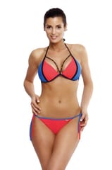Smooth cups with contrasting black trimming are stiffened, without push-up, well collect and stiffen the breasts while bringing them closer to each other. The neckline is complemented by two decorative straps finished with tiny jewelry. Tempting briefs, such as low hips are a very feminine proposition for the beach. Italian fabric. Composition: 80% polyamide, 20% elastane.