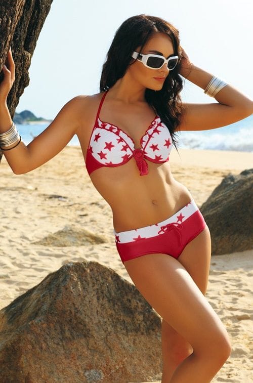 Do you dream of comfort on the beach? Choose a costume with a push-up bra and shorts included! Here is a duo that will allow you to look sexy and at the same time guarantee full comfort on the beach. The bra is decorated with a delicate, slightly shiny pattern and jewelry decorative in the middle of the model. Its white background perfectly emphasizes the tan. Neckline with subtle trimming. Stiffened construction, on underwires, with push-up cushions included in the set (you can remove them from the bra). Shorts are a great alternative to traditional briefs. Composition: 80% polyamide, 20% elastane.