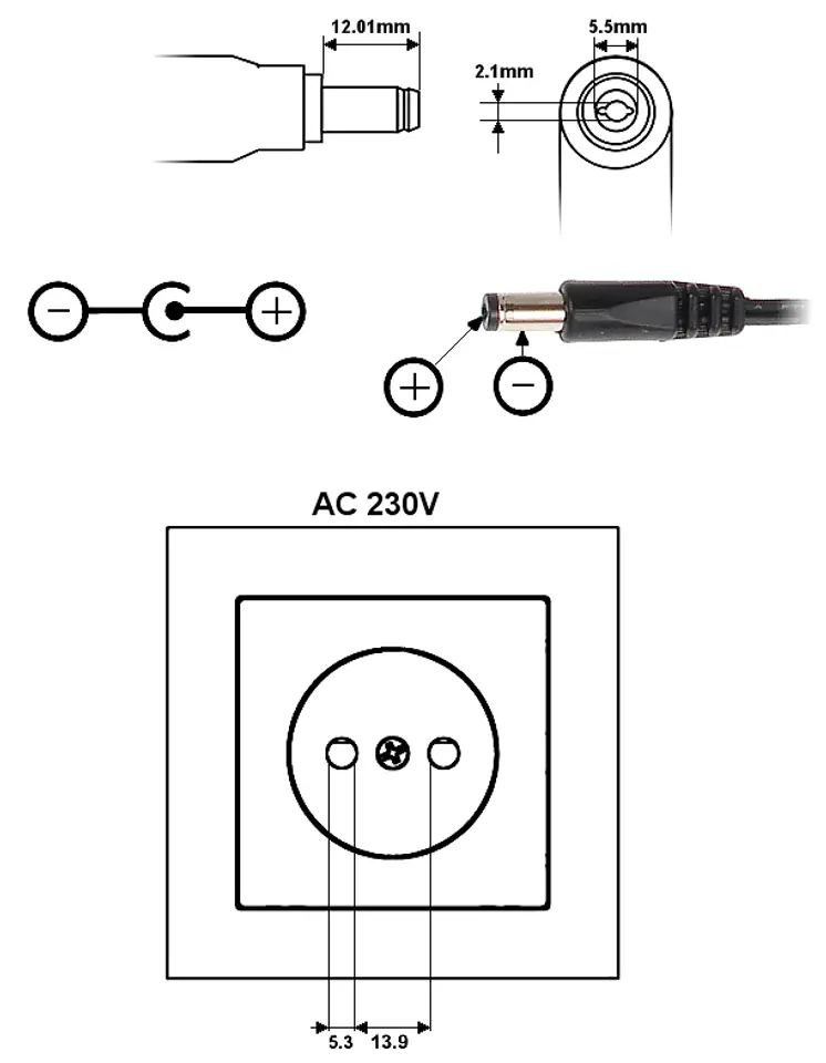 | Power connector type: | 230 V Plug 12 V - 2.1/5.5 mm Straight plug |