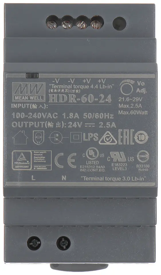 Switched-mode power supply installed on TS35/7.5 or 15 DIN rail, resistant to high operating temperatures (up to 70°C)