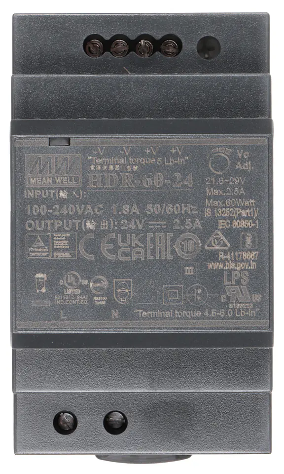 Switching mode power supply 24V DC 2,5A 60W input. 100-240V AC 1.8A HDR-60-24