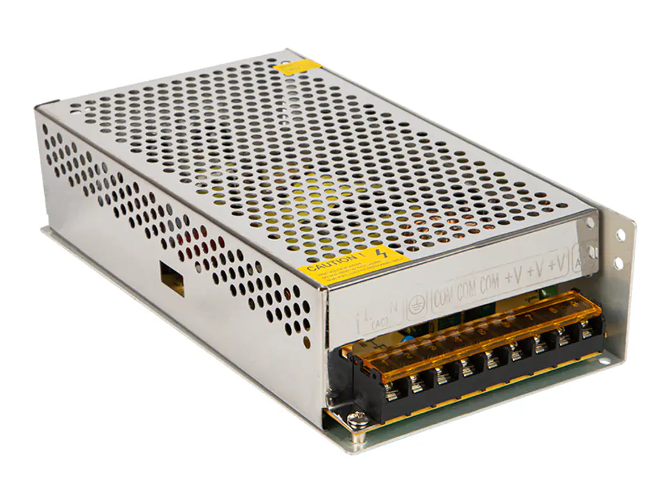 250W switching power supply. It is ideal for powering LED strips and modules, panels, CCTV installations, as well as for many other industrial electronics devices powered by 12V voltage. The power supply has a built-in LED signaling the operation of the device, a potentiometer for voltage regulation at the output and a voltage switch 110-220V.