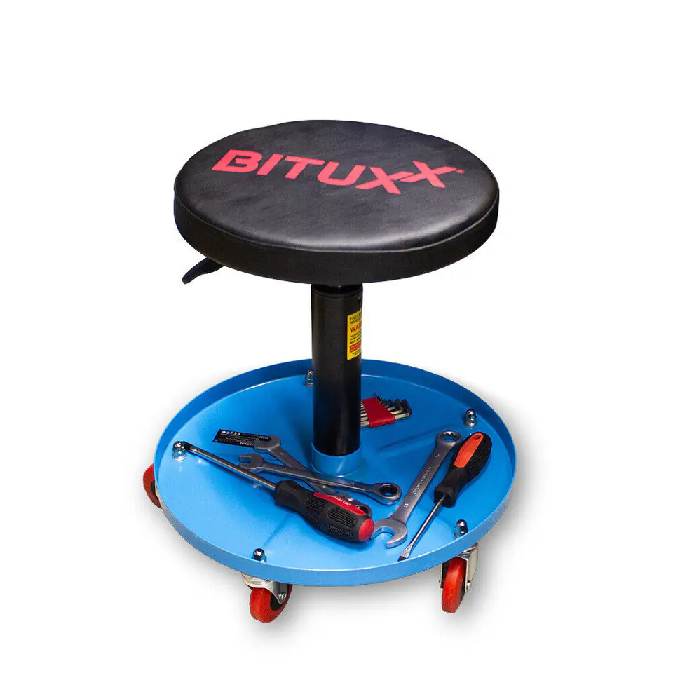 In the base there is a container for tools and accessories necessary during work. The workshop chair is useful in all kinds of workshops, services and garages. The swivel seat allows the user to adopt a comfortable working position, five swivel rollers increase mobility during work. The solid construction allows for a load of up to 135kg, characterized by an attractive price-quality ratio.