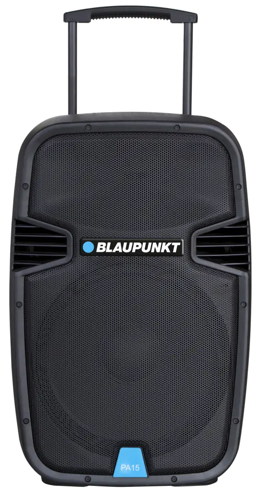 PA15 PLL Karaoke Audio System Professional audio system PA15 by Blaupunkt is a product created to meet the expectations of users who value excellent sound quality in all conditions. A solid housing, a very powerful amplifier or high-quality drivers, including a mid-woofer with a diameter of 38cm, are just a few features of this product that will make it perfect for your company, gym, SPA or fitness salon, as well as add splendor to a party at home or garden. Wireless Power The total musical power of the PA15 system is 700 Watt. This high value combined with the right configuration guarantees an unparalleled acoustic experience. Thanks to the built-in battery, the device can work both in wireless mode and when connected to the mains power supply. The battery life is 3.5 hours, while the time needed to fully charge is 9 hours. In addition, using the socket on the rear panel, it is possible to connect an external battery with a voltage of 12V.Extraordinary functionalityThe built-in Bluetooth module allows you to play music wirelessly from most mobile devices such as smartphones or tablets. On the back of the housing there is a control panel and a set of connectors - AUX input and output, USB port and SD card reader with a maximum capacity of up to 32 GB. So you can listen to music from all kinds of portable memory and mobile devices connected with a cable. The device plays all files saved in MP3/WMA format. With the equalizer offering normal, rock, pop, classic, jazz and news modes, you can customize the sounds to your liking. There are also knobs on the rear panel for adjusting high and low frequencies. Built-in fm tuner If you don't have a portable device with music files or Bluetooth, you can still listen to music thanks to the built-in FM tuner with up to 99 radio stations. Such a large number will mean that you do not have to search for your favorite radio station every time. Convenience of use You can conveniently control the entire system remotely thanks to the included remote control. For your convenience, the system is also equipped with wheels and a retractable handle, thanks to which it can be safely transported, and the tripod socket located in the lower part of the housing allows its stable attachment when used stationary. Karaoke function Another distinguishing feature of PA15 is the karaoke function with a microphone, which will make every party more attractive, and each participant will be able to feel like a stage star. Singing together is great fun for both children and adults. To meet the expectations of the most demanding customers, the device has independent adjustment of the sound of the microphone in the high and low frequency range. It is also possible to optimize the echo effect using a separate knob. For example, an additional microphone input can support an optional wireless device. Thanks to the fact that the whole is enclosed in one housing, the PA15 audio system is an ideal alternative to all kinds of towers and classic devices with separate speakers. If one speaker is not enough for you, you can connect another one to it using AUX inputs and outputs! One of them becomes the main unit from which you control all sound sources, and the other doubles the power offered! Find out how much fun it is to listen to music on professional equipment!