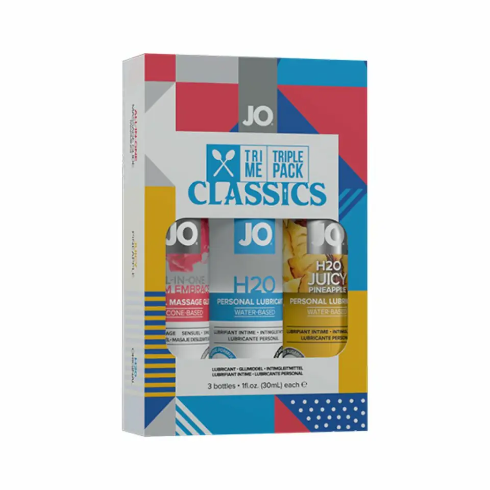System JO - Tri Me Triple Pack Classic 3 x 30 mlJo Tri Me Triple Pack Classics gift set contains a one oz bottle of H20 Classic, Warm Embrace Massage Glide, and Juicy Pineapple personal lubricant.KEY FEATURES- A simple grab and go kit for romantic adventures- Perfect as a gift for beginners or couples- FRAGRANCE-FREE for consumers with fragrance sensitivitiesJO H2O is a water-based personal lubricant designed to supplement the body's natural lubrication. Formulated using a purely plant-based glycerin, this top selling lubricant is designed to provide a silky smooth and comforting glide with no stick or tack residue. Plus, JO H2O is toy friendly, condom compatible and easy to clean. Simply apply and play!JO ALL-IN-ONE MASSAGE GLIDE is a silicone-based massage glide that also works as a tattoo brightener and skin conditioner. Formulated using only the highest quality silicone, this product collection provides an amazing touch sensation. The silky smooth glide makes it the perfect partner for an almost effortless full-body massage experience. A little goes a long way!The JO Juicy Pineapple offers a flavorful array of personal lubricants designed to enhance foreplay and intimacy. Formulated with a pure plant-based glycerin and infused with natural flavor extracts, this collection will excite the taste buds and appetite for pleasure. No added sugar or artificial sweeteners also make this a guilt-free addition to bedroom play!3 x 30 mlIngredients:JO H2O: Glycerin (plant sourced), Water (Aqua), Cellulose Gum, Methylparaben, PropylparabenJO All in one massage glide: Dimethicone, Cyclopentasiloxane, Cyclotetrasiloxane, DimethiconolJO Juicy Pineapple: Glycerin (plant sourced), Water (Aqua), Flavor (Aroma), Cellulose Gum, Methylparaben, Propylparaben