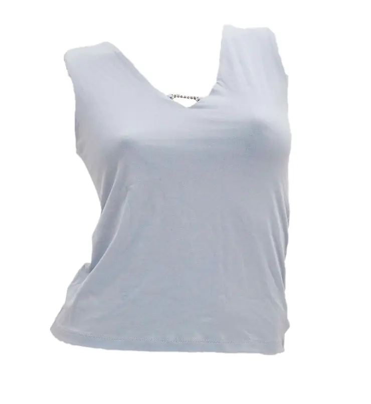 Women's sleeveless T-shirt, made of elastic fibers that adapt to the body, providing comfort. Decorative zirconia strap on the front neckline. Perfect under a jacket or as an independent stylization.