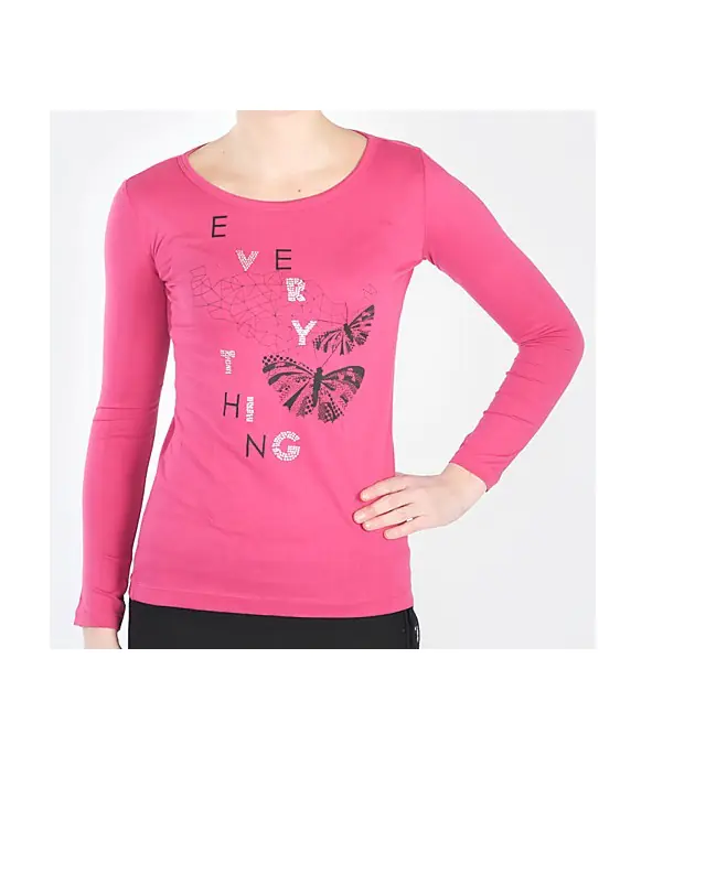 Koszulka damska z długim rękawem, wykonana z wysokogatunkowej bawełny. Z przodu modny nadruk. Skład: 100% bawełna.