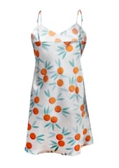 Beautiful, classic T-shirt of the night made of patterned satin. On thin straps with adjustable length, thanks to which the top of the shirt looks light and allows you to expose the shoulders. V-neckline. Cut loose, airy, feminine, highly comfortable. Composition: 100% polyester.