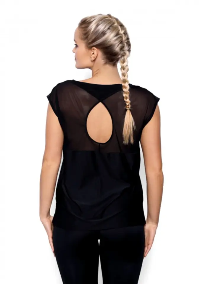 Stylish blouse from the Fit by Eldar collection - completely smooth at the front, and on the back in large part decorated with mesh tulle with a clearance effect. Short sleeves, nice almond neckline and loose cut will favor your comfort. Composition: 86% polyester, 14% elastane.