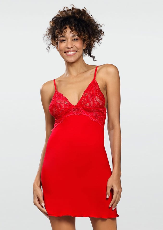 Elegancka i bardzo kusząca koszulka nocna wykonana z przyjemnej w dotyku wiskozy. Połączona z miękką, kwiecistą koronką, widoczną w rejonie biustu i na plecach. Krój lekko dopasowany do ciała, zgrabny, do tego ładny dekolt z koronkowymi miseczkami i smukłe, regulowane ramiączka - oto czarujący i bardzo udany projekt marki DKaren. Skład: 92% wiskoza, 8% elastan.