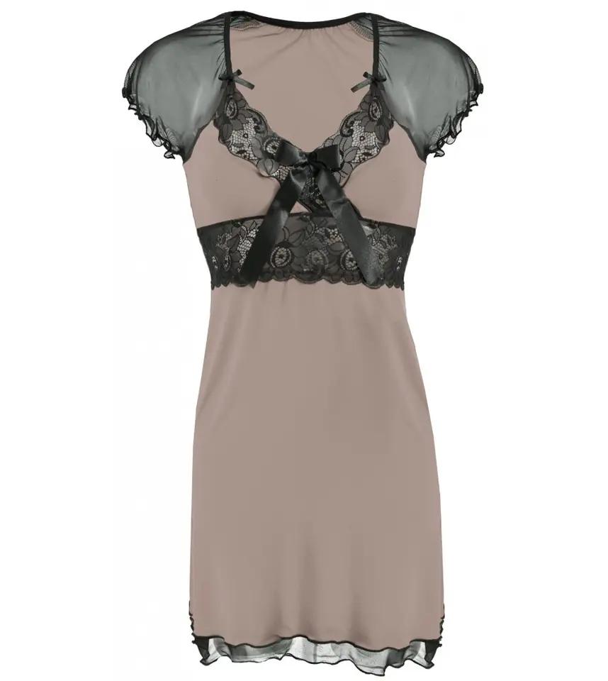 Sexy night hook, with a neckline decorated with floral lace. Under the bust also lace application. Cut slightly fitted to the body. Knitwear soft and elastic, pampers the skin. Sleeves made of smooth tulle. Composition: 92% viscose. 8% elastane.