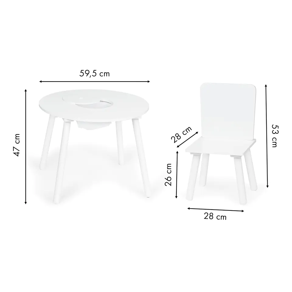 A great set for all children, thanks to its simple form, will perfectly fit into the decor of children's rooms, playrooms or waiting rooms. The table has solid pine legs that give it stability, the top is made of MDF which makes it easy to maintain and resistant to damage / scratches. The set is complemented by two stable and comfortable chairs.