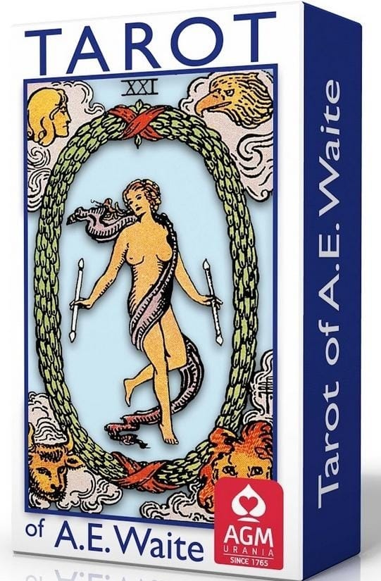 A set of 78 Tarot cards with instructions. Created by Arthur E. Waite and British illustrator Pamela Colman Smith. Manual in English.