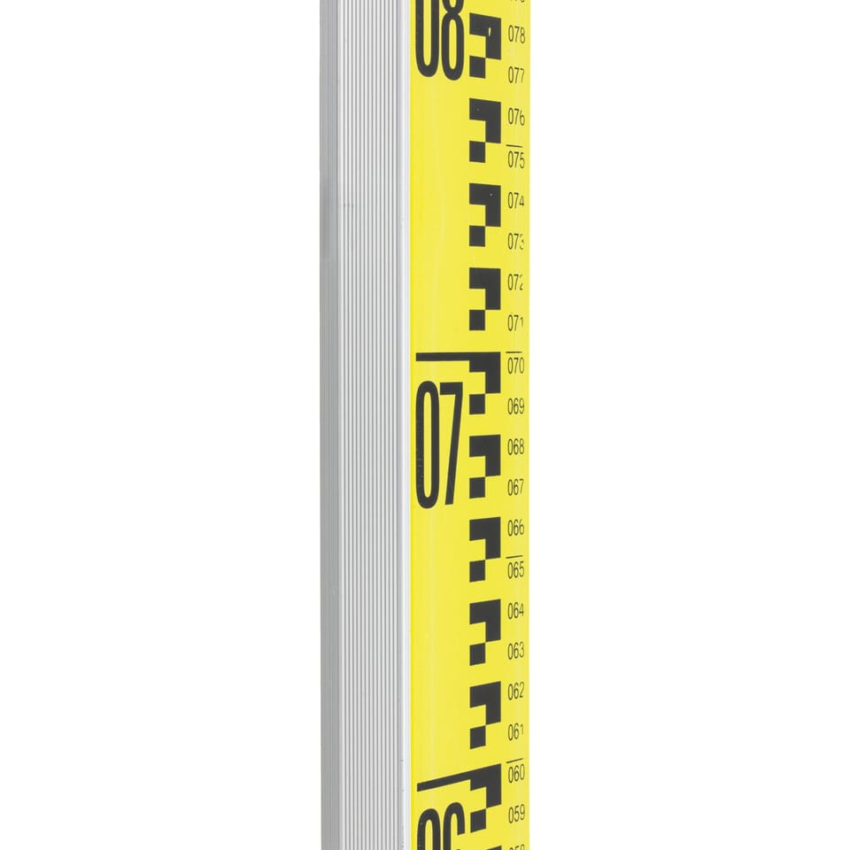 Telescopic leveling patch designed for height readings using optical levels as well as rotary lasers. Made of aluminum alloy. The patch consists of 5 telescopically extendable sections with a maximum height of 5m. Geodetic scale E at the front for measurements with a level over long distances. Mm scale at the front for measurements with a level from close distances. Durable carrying case with easy carrying strap