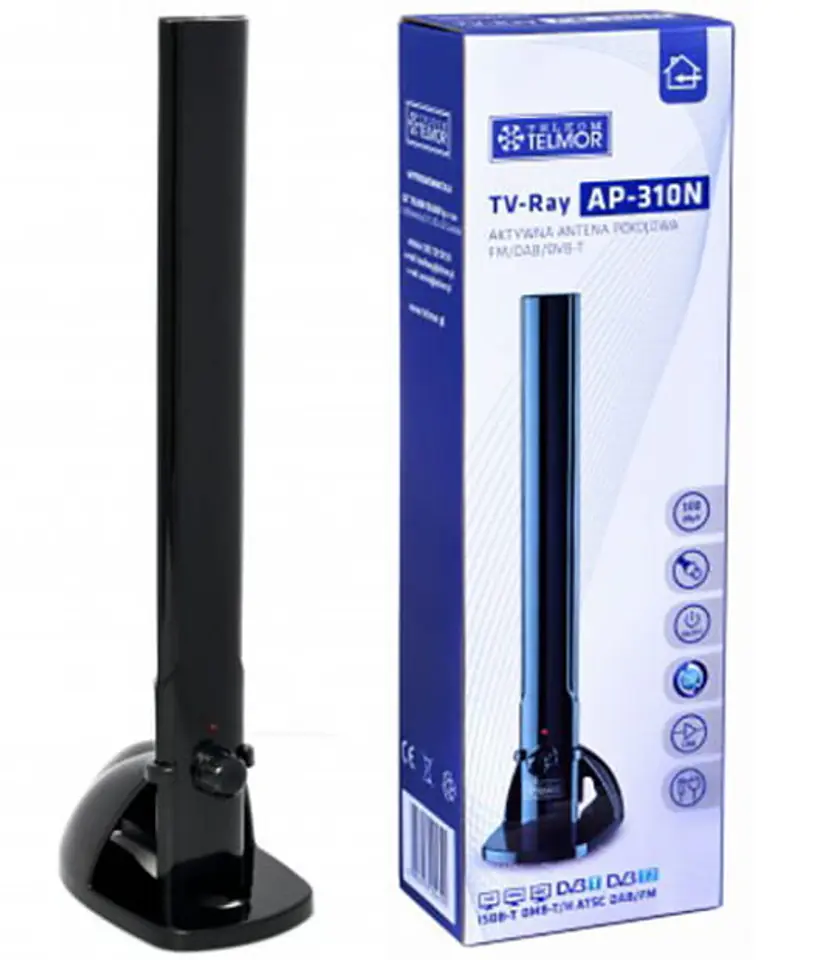 The AP-310N TV-Ray series is a panel room antenna designed specifically for analog (FM) and digital terrestrial radio (DAB/DAB+) and digital terrestrial TV (DVB-T). It is an active antenna with built-in gain adjustment, which can be powered by an external plug-in power supply (complete with an antenna) or via a coaxial cable connected directly to a TV or external STB tuner.