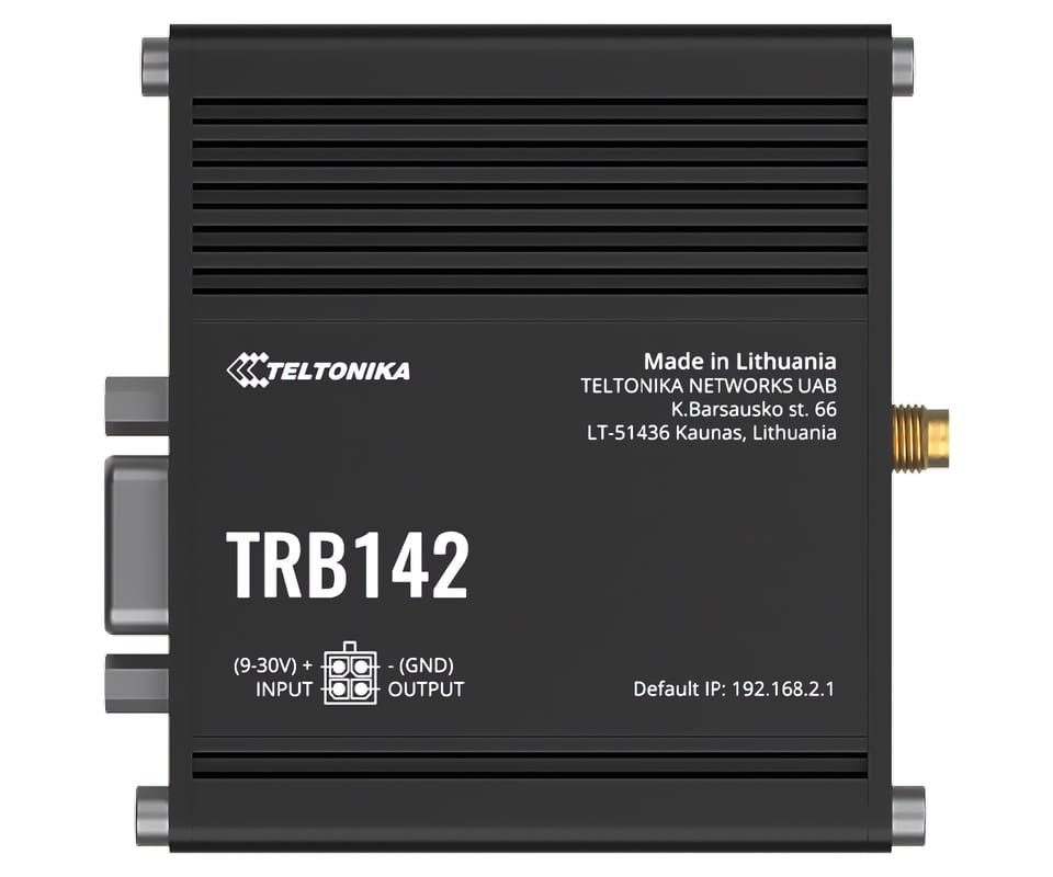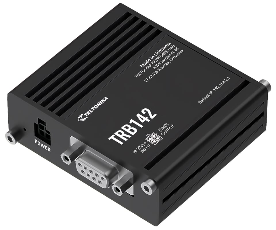 TRB142 is a very small, lightweight, energy-efficient industrial gateway equipped with a widely used RS232 interface for remote control of devices and an LTE Cat 1 module for reliable communication and OpenWRT-based software. It can be easily adapted to various needs.
