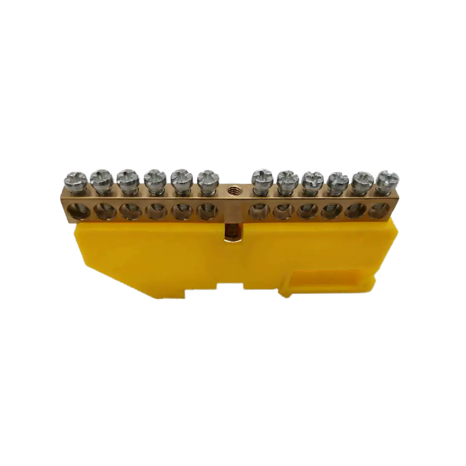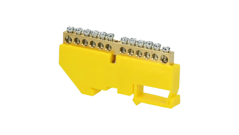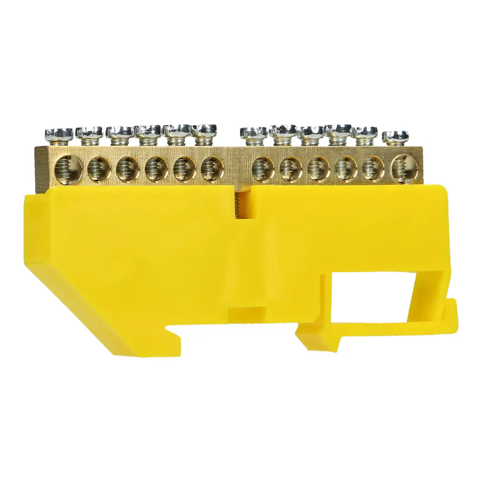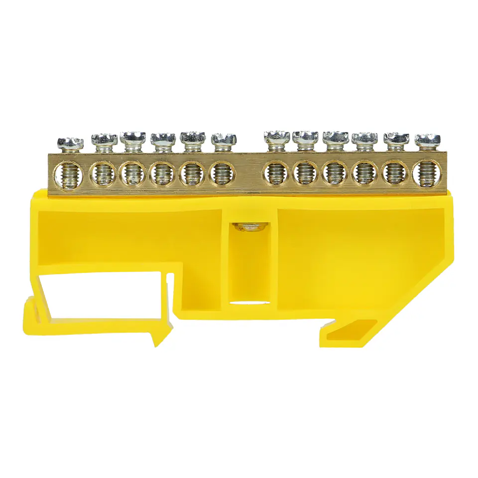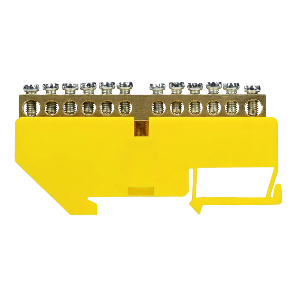 Terminal block for ground wire (yellow). Used in electrical switchboards, it facilitates the distribution of potentials and wiring. Suitable for DIN rail mounting.