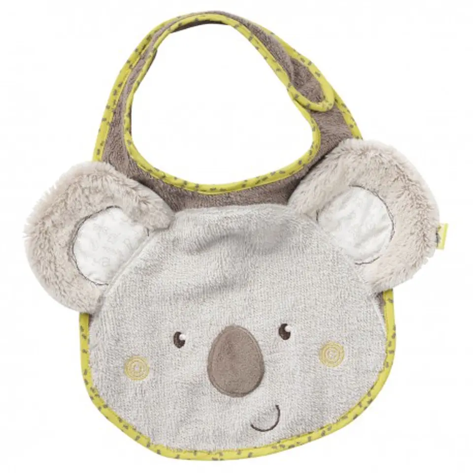 Terry velcro bib, from the collection: Australia It presents the head of a smiling, friendly Koala Bear, sewn into the border of the bib, with hanging, delicate to the touch, ears, which can be rubbed, squeezed or pulled, which attracts the eye and distracts the attention of even the biggest "Eater". The optimal size of the bib and absorbent material from the highest quality terry is skin-friendly and will provide effective protection of the baby's clothes from dirt. Thanks to the practical velcro closure, its size and fixation can be adjusted. It is easy to put on and take off, adapting perfectly to the child's neck. This makes the food even more fun! Very absorbent material with the highest quality terrycloth. Easy to keep clean. Adjustable velcro closure is convenient to put on and take off. Dimensions: 30 cm. All toys of the German brand FEHN are safe for children from 0 years. They are made of the best quality materials. They meet EN71, CE standards, tested in the institutes "Stiftung Warentest"" or "Ökotest". 64216