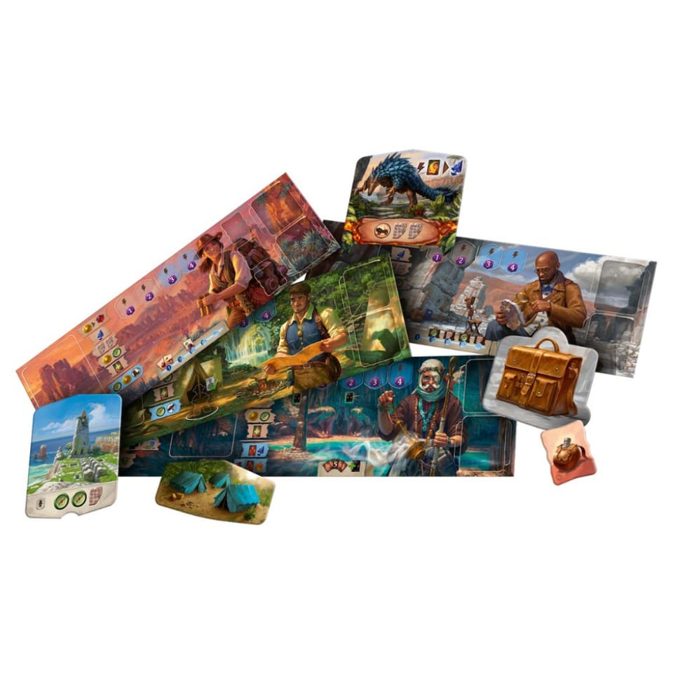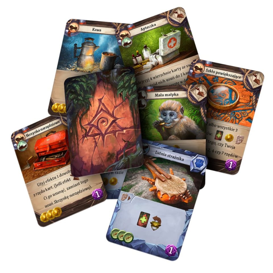 It is an adventure game that combines the mechanics of deck building and worker placement. During the game players explore successive corners of the board and discover unknown terrains, skillfully managing the gathered resources. In addition to the classic effects, available cards are also used to deploy workers, and along with the discovery of successive parts of the island, completely new actions appear, which we will be able to perform. Some of them will require specific resources, so building a solid base will be crucial.