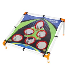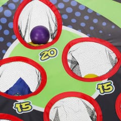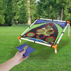 The game consists of the child aiming (who can stand behind the designated line) to the holes in the game board and throwing bags at them. Individual holes have point markings.