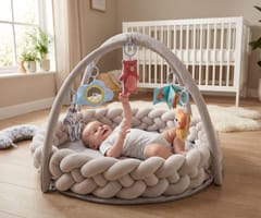 Mata edukacyjna dla niemowląt – od kiedy?Mata TinyMini Warkocz jest odpowiednia od pierwszych dni życia. Na początku służy jako bezpieczna przestrzeń do leżenia i obserwacji, a wraz z rozwojem dziecka wspiera ćwiczenia na brzuszku i aktywną zabawę.Idealna mata na prezent i wyprawkęMata edukacyjna TinyMini Warkocz doskonale sprawdzi się jako: