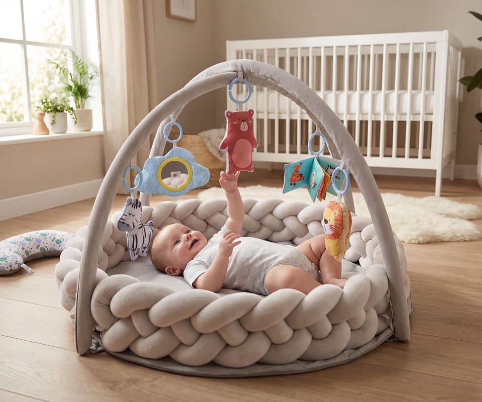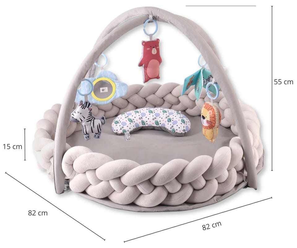 Mata edukacyjna TinyMini Warkocz to bezpieczna i komfortowa mata edukacyjna dla niemowląt, zaprojektowana z myślą o dzieciach już od pierwszych dni życia. Charakterystyczne, miękkie boki w formie grubego plecionego warkocza tworzą przytulną przestrzeń do zabawy, odpoczynku i nauki ruchu.Nowoczesny design łączy estetykę z funkcjonalnością, zapewniając dziecku poczucie bezpieczeństwa podczas codziennej aktywności.Jak dziecko korzysta z maty TinyMini Warkocz?Ta mata edukacyjna interaktywna dla niemowląt wspiera rozwój na wielu poziomach: