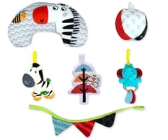 - 4 zabawki (słoń, zebra, drzewko, piłka)