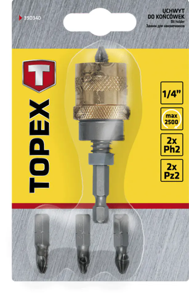 TOPEX screwdriver bit holder (ref. 39D340) 65 mm long, included with four tips. Designed for screwdrivers and drill-screwdrivers with a tip in size 1/4. Thanks to a special mechanism, it is possible to fix the bit at an optimal depth. The TOPEX brand is addressed to DIY enthusiasts.